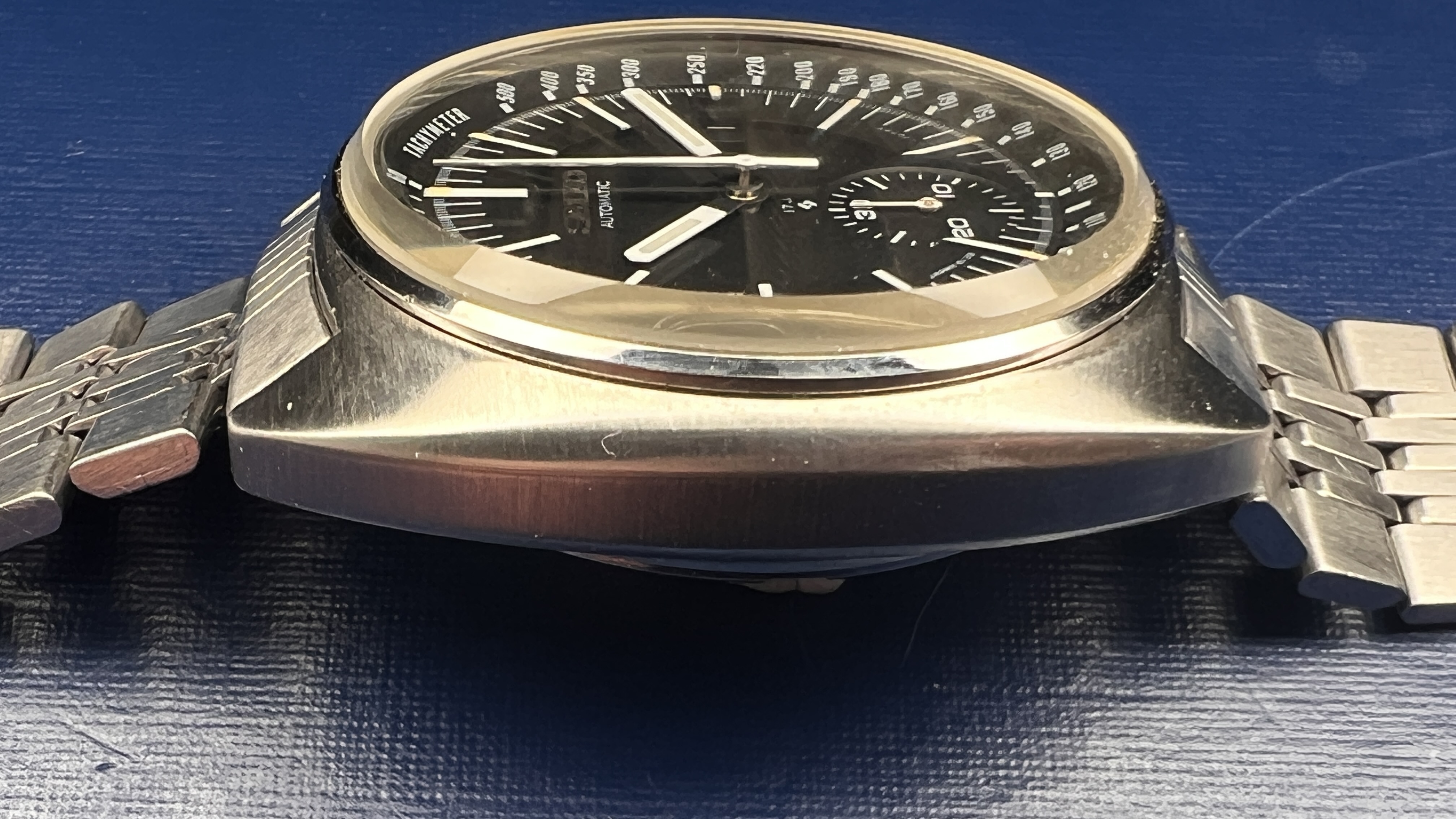 For your consideration is a February 1972 6139-7039 “mini-Jumbo” Automatic Chronograph. All components are original to this watch including the hands, dial, case, crown, pushers, and all mechanical components. The bracelet is a Seiko Z368. The case is NOS and still retains its case back blue cover and inspection sticker.