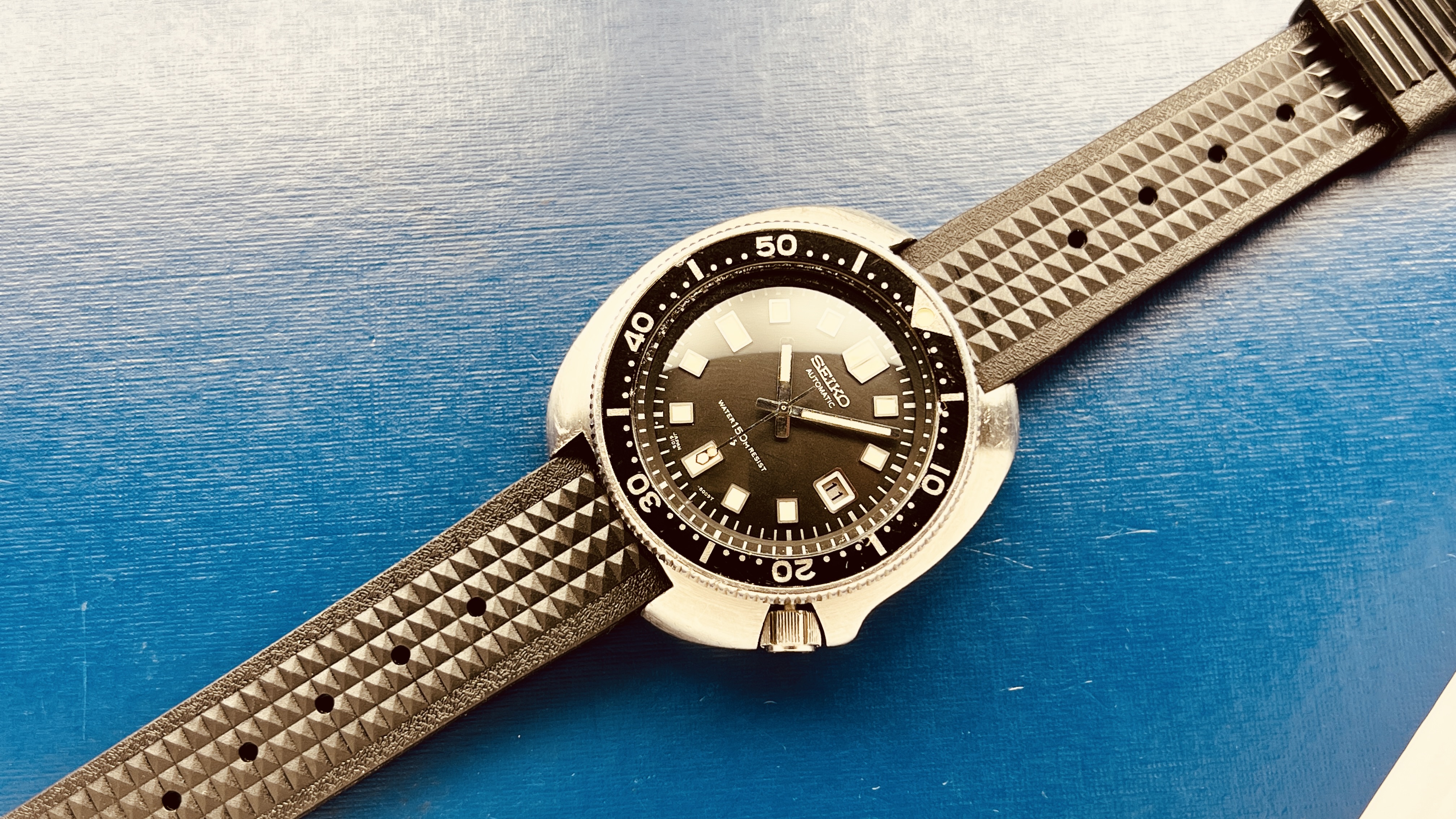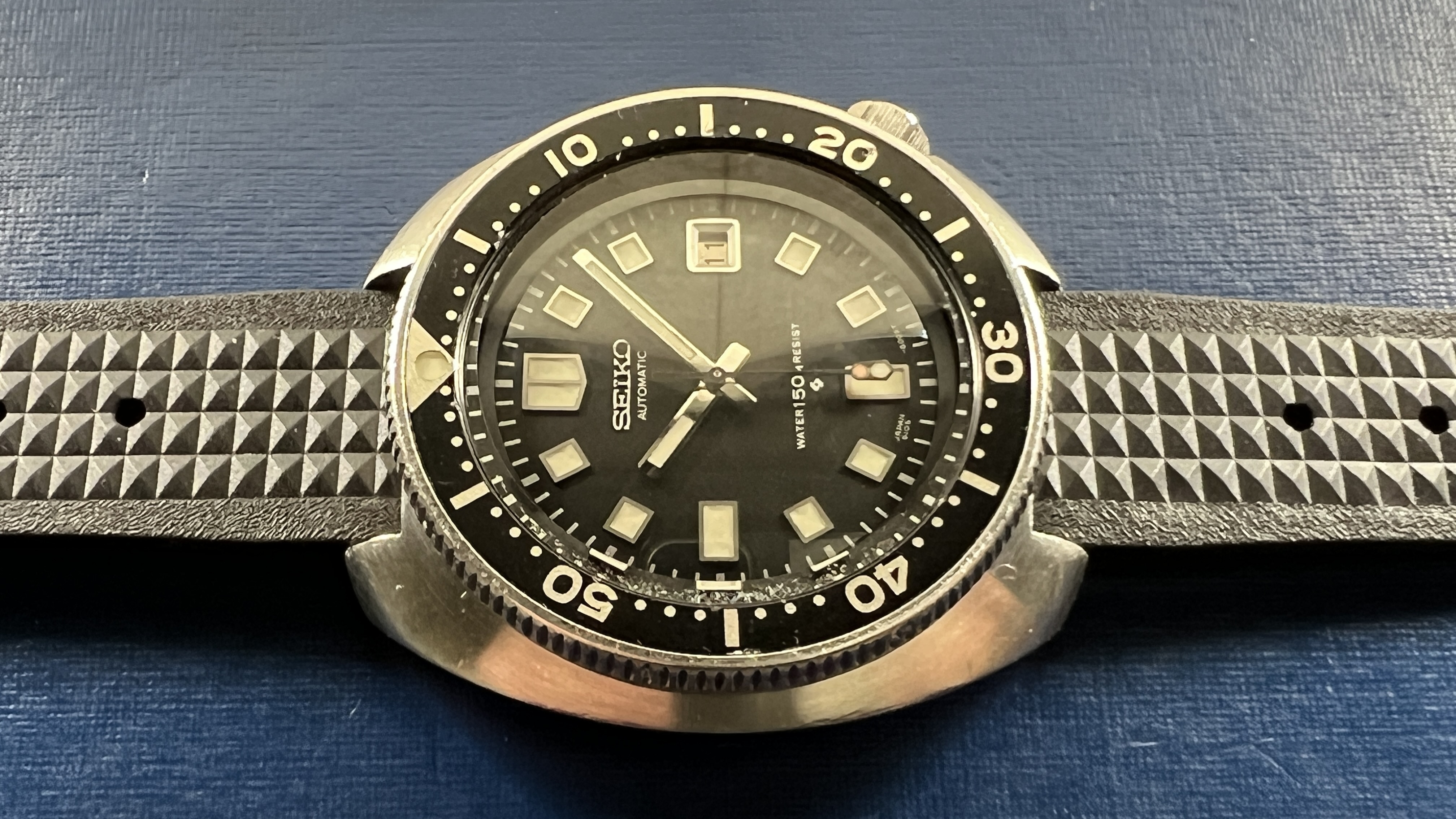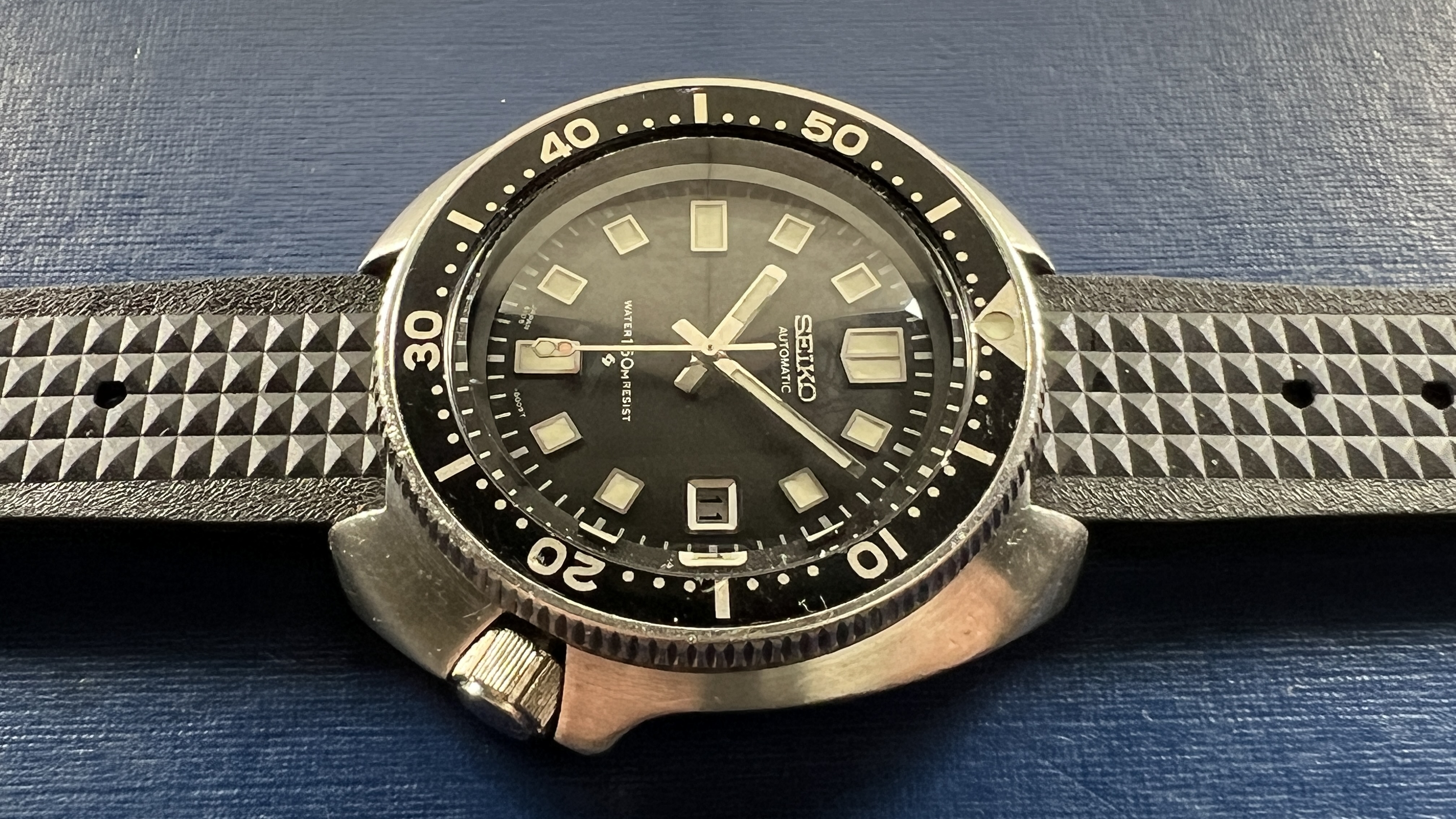 For your consideration is a February 1975 6105-8110 diver — otherwise known as the “Captain Willard”. This is perhaps the most highly sought after Seiko diver’s watch. All components are completely original to the watch. The crystal is a Klein Type III . The watch comes with a new waffle band from Uncle Straps. I will also include the replaced upper mainspring bushing and the crown seal that was replaced. The dial and hands on this watch are in excellent condition.