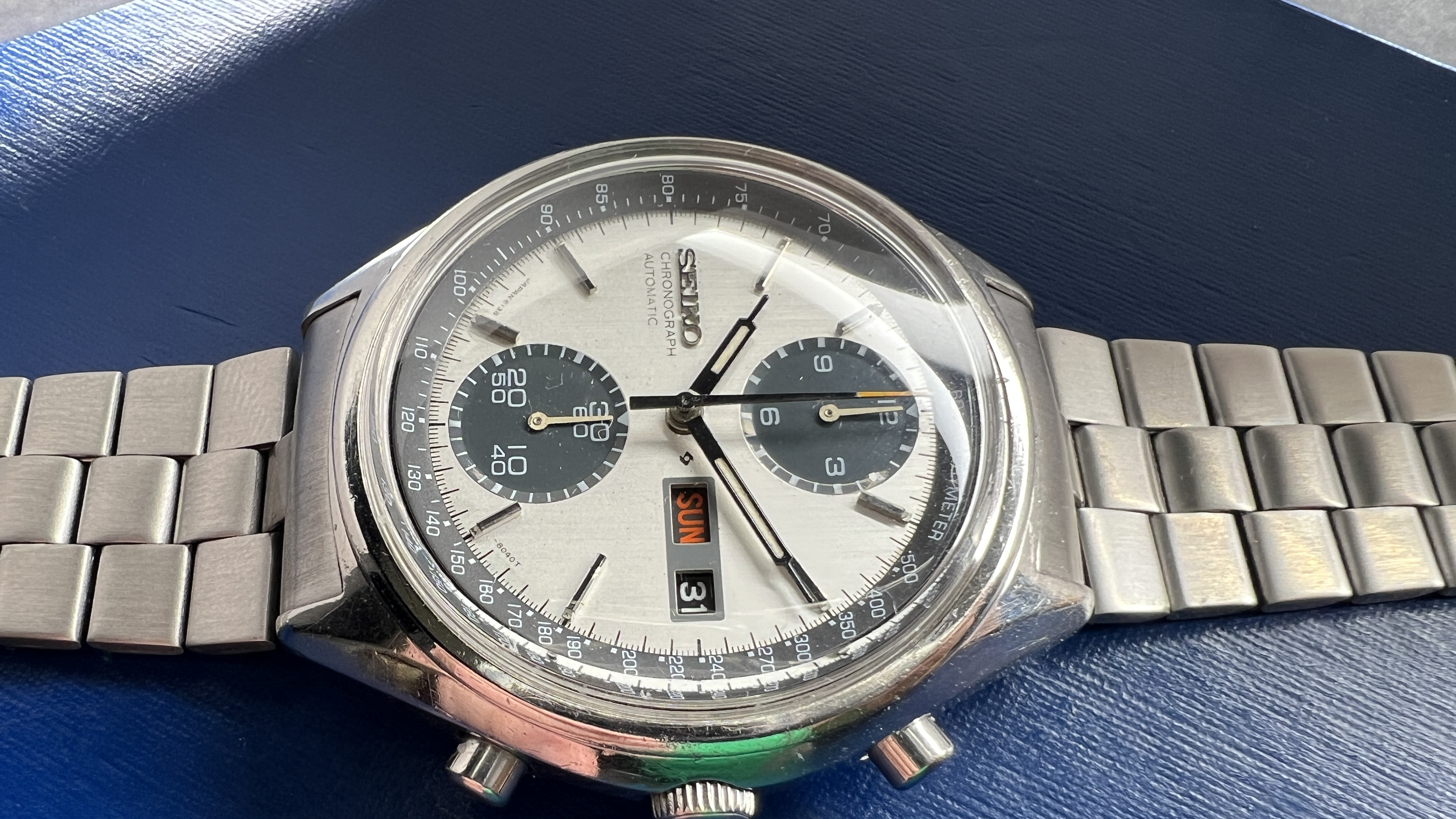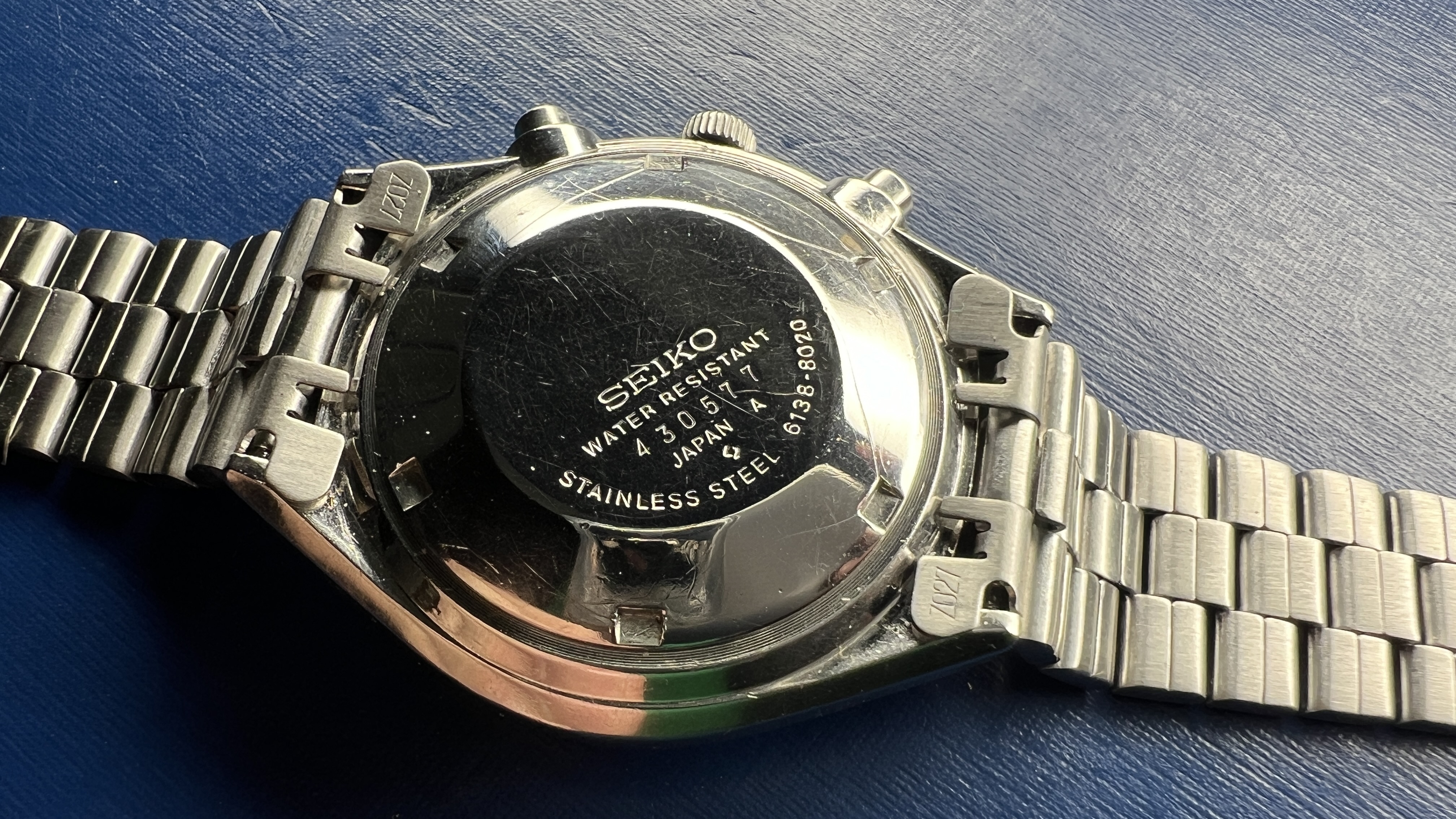 The watch is completely original and is in very good condition. The dial and hands are original to the watch and the dial back has a date that is three months away from the caseback (46). The dial maintains the lovely champagne linen pattern with the beautiful off-green sub-dials. The dial and hands retain the very clean factory applied lume. The hands reset to their vertical positions. The crystal is a new acrylic Sternkreuz, which is an exact reproduction. The bracelet is a Seiko branded Z027 from the aftermarket.