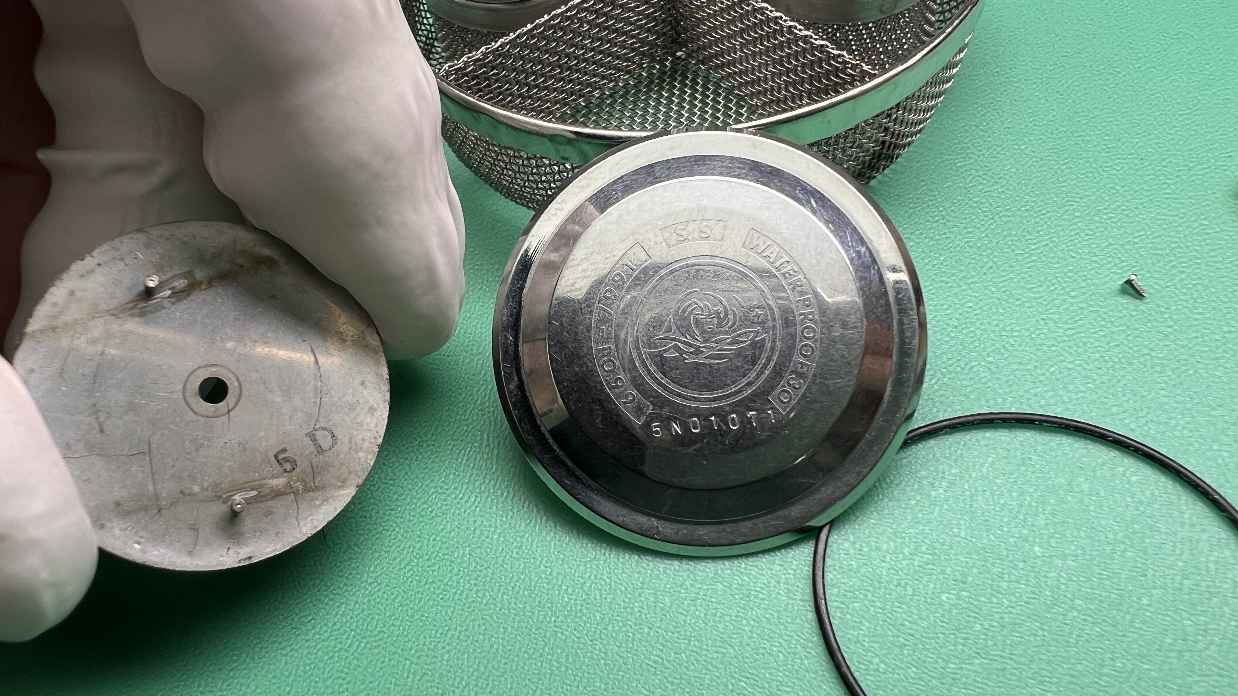 This watch has received a full service. That process includes a full cleaning and evaluation of all movement components and proper lubrication. It also means that the crown has been mechanically rebuilt and is now capable of keeping moisture out. Lubricants used were Moebius synthetic varieties appropriate for this watch movement type. The movement has two custom produced, American made jewels in the ports of the barrel arbor. The amplitude of the balance wheel is 230-240 range and the rate is (+/-) 2 sec/day. The case back and crown all have new, and factory correct seals. This watch comes with a 100% money back promise of originality and a 1-year limited warranty on the movement from the time of sale.