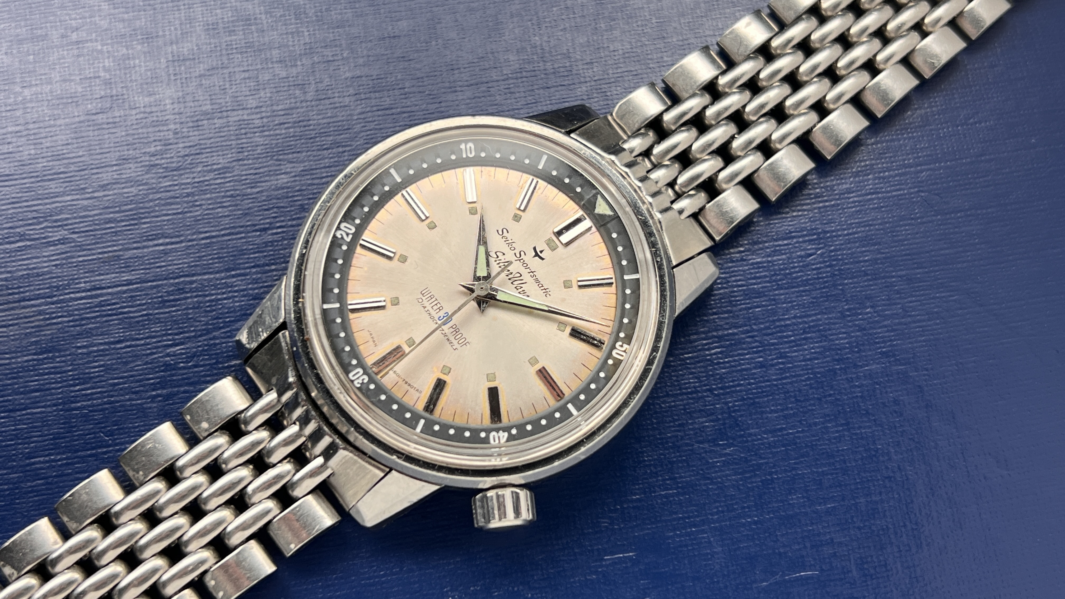 For your consideration is a November 1965 6601-7991 SilverWave no-Date Sport Diver. It is very rare that these come available and they often have succumb to water damage. The crystal is an NOS seiko component and the bracelet is a beads of rice from the era. I cannot confirm that this is the original bracelet to the watch, but it is of the period.